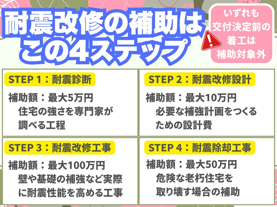 制度の内容は、耐震性能に不安のある住宅を対象に、耐震診断・耐震改修設計、耐震改修工事、耐震除却工事の、各段階に応じた補助金を支給するというものです。特に、耐震改修工事については費用の2分の1の補助、最大で100万円が支給されるため、経済的な負担を大きく軽減することができます。