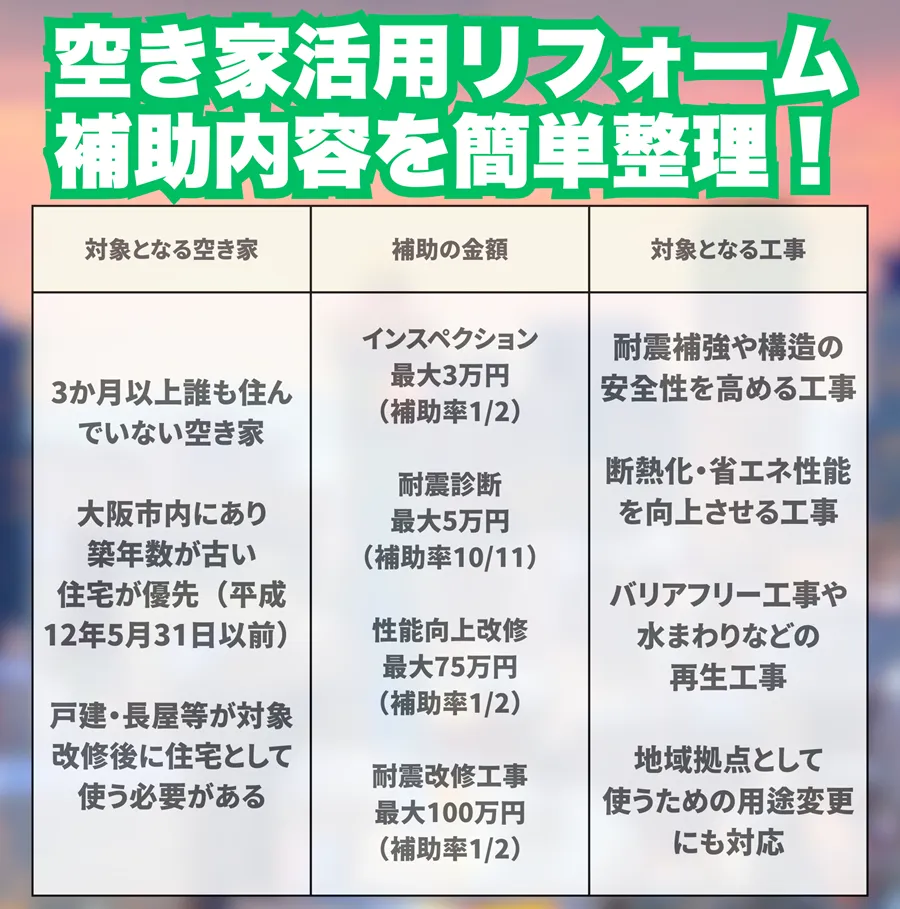 大阪市では、放置された空き家を良質な住宅ストックとして再生し、安全で快適な住まいや地域の活性化につなげる目的で、空き家活用リフォーム補助制度(空き家利活用改修補助事業)を実施しています。