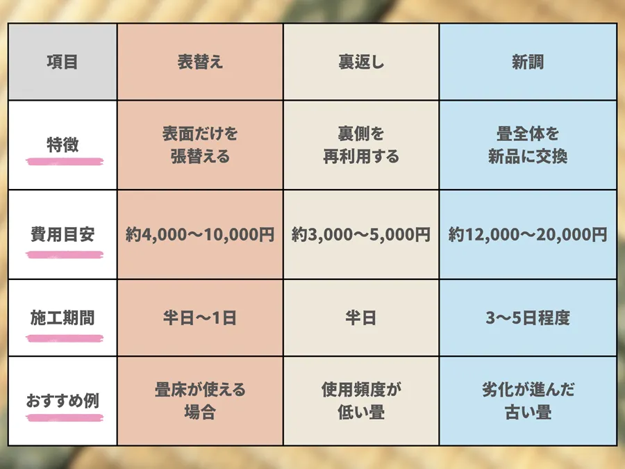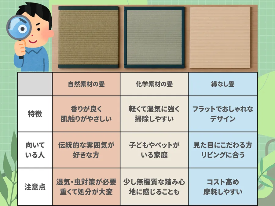 見た目は似ていても、使い心地や耐久性、費用面には大きな違いがあります。 本記事では畳を張替える際に選べる主な3つのオプションと、それぞれの素材が持つメリット・デメリットをわかりやすく比較します。