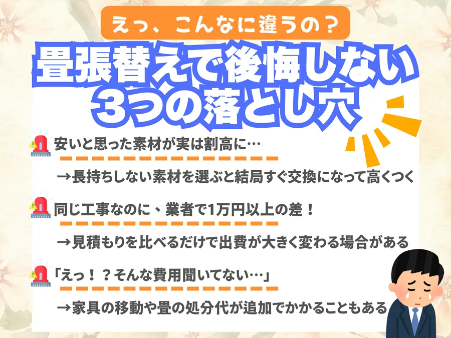 ここでは畳張替えで後悔しないための3つのポイントを紹介します。