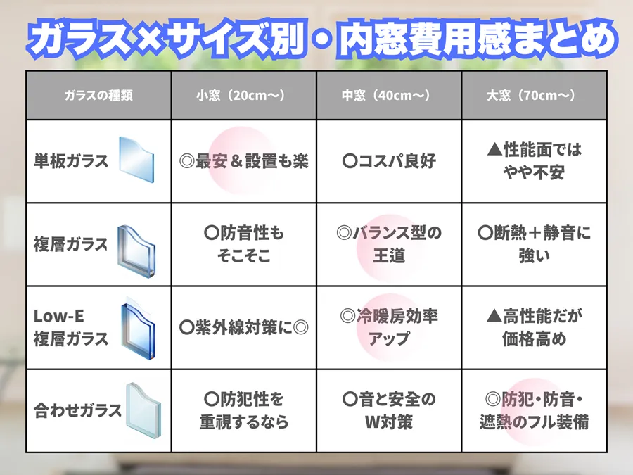 単板ガラス、複層ガラス、Low-E複層ガラス、合わせガラスなど、それぞれの特徴と参考価格を把握することで、目的に合った最適な内窓を選ぶことが可能です。