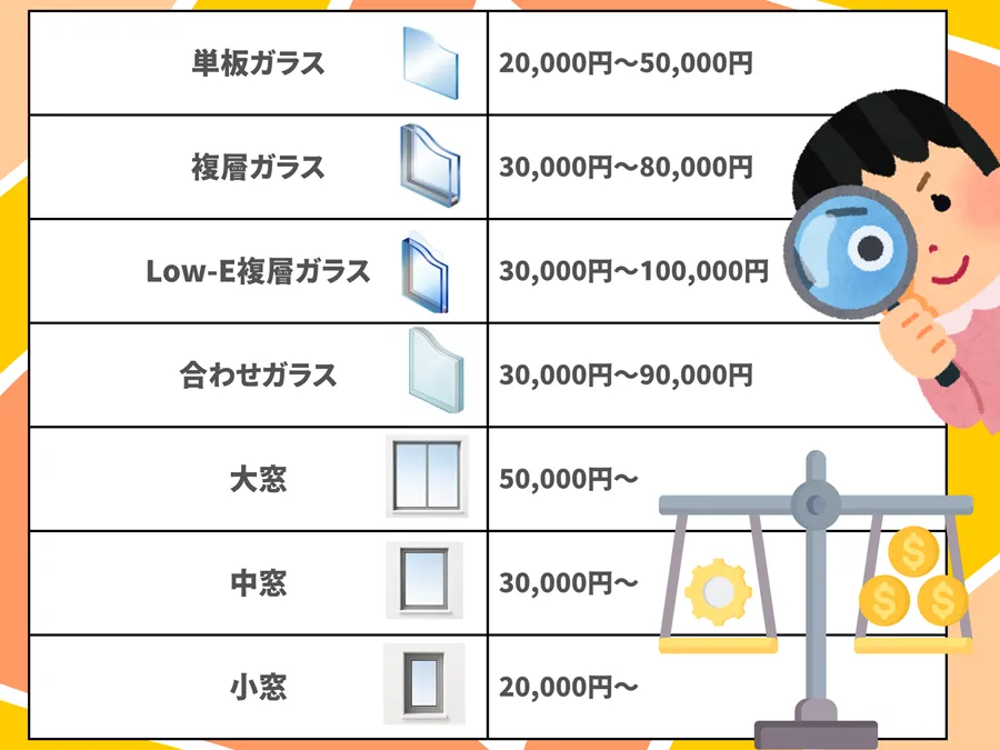 | 単板ガラス | 1枚のガラスで構成されたシンプルな仕様が特徴。コストを抑えたい場合に最適。 | 20,000円~50,000円 |