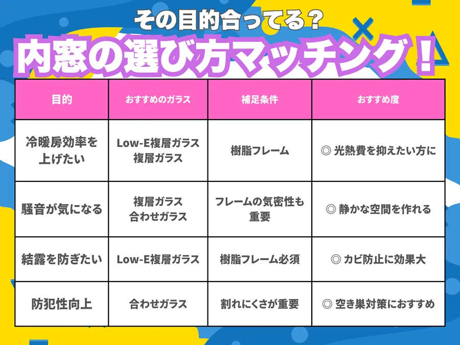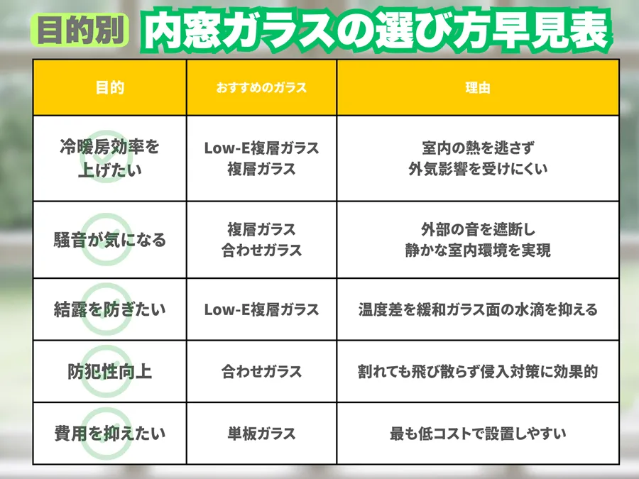 選び方のポイントは、断熱性重視なら複層ガラスやLow-E複層ガラス、防音や防犯を求めるなら合わせガラスが適しています。
