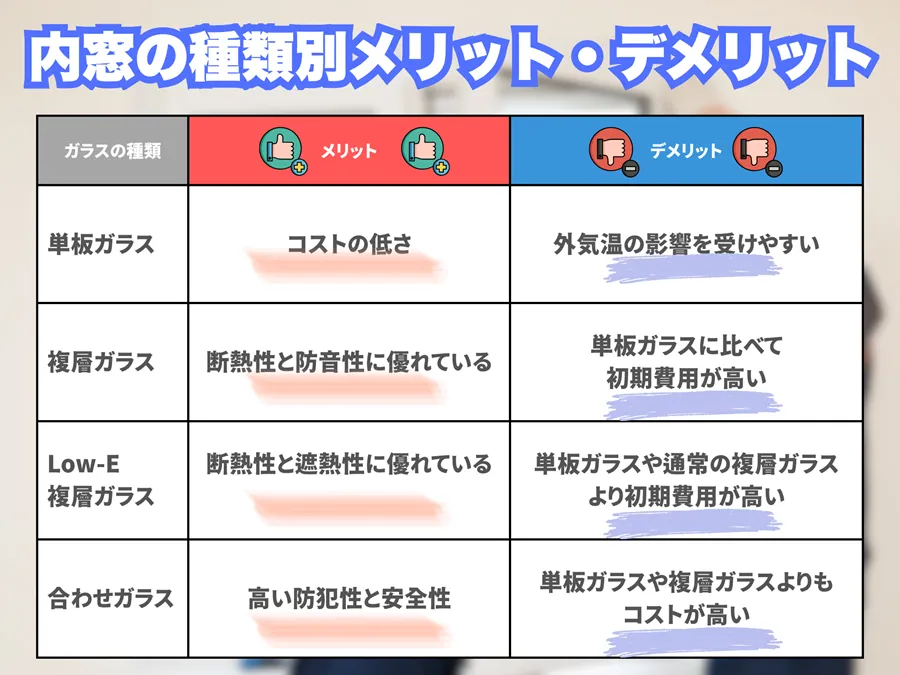 それぞれのガラスによって利点や費用が異なるため、用途に合ったタイプを選ぶようにしましょう。
