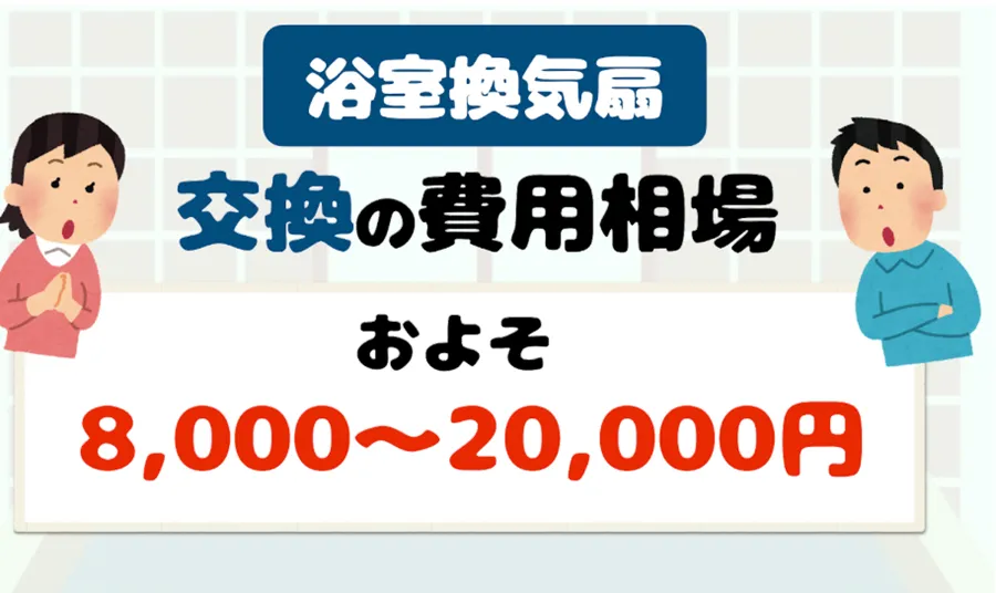 それでは浴室換気扇交換の費用相場について解説していきます。浴室換気扇の種類にもよりますが、施工のみに必要な交換費用の相場は約8,000〜20,000円です。