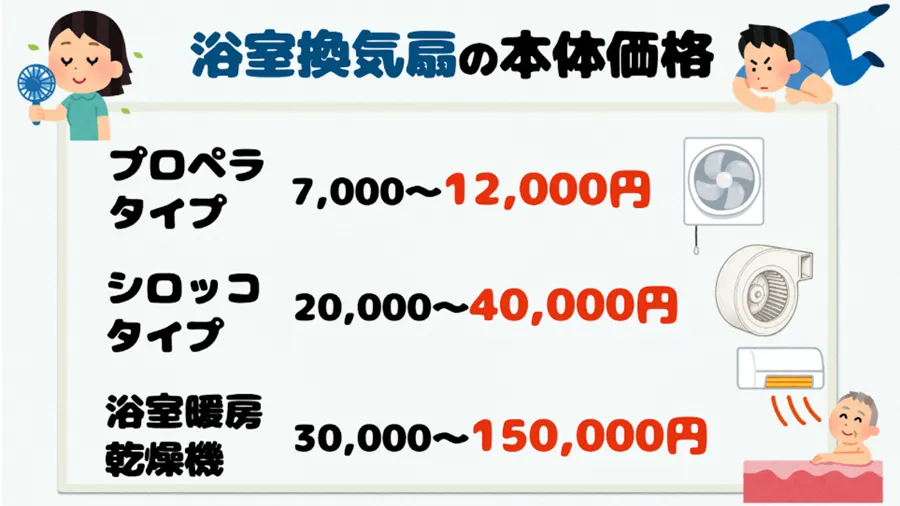 | 浴室換気扇の種類 | 本体価格 | 交換費用 |