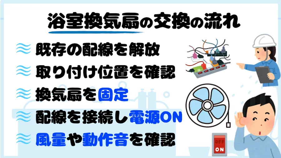 - 浴室換気扇の交換の流れ(シロッコタイプなどの専門工事が必要な場合)