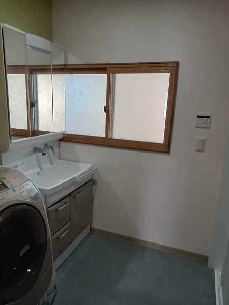 工事内容: 浴室を1616サイズのユニットバスに変更。洗面所一新(面積を広げ、断熱工事、洗面台の変更、クロス張り、二重窓に変更)。浴室と洗面所に換気扇兼ガス式暖房設置。給湯器変更。浴室及び洗面所のサイズ拡大により、和室の一部を削ったため、基礎工事、押入の一部をクロゼットに変更。畳をフローリングに変更。同部屋の窓を二重窓に変更。廊下、浴室などに手すりを設置。