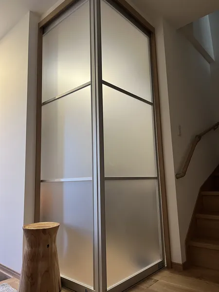 玄関入ってすぐの部屋をオープンさせておくと圧迫感ないかなと両開き?の扉にしてもらいました。来客以外は開きっぱなしですが、来客があればサッと閉めてもがっつり壁じゃないのがいいです