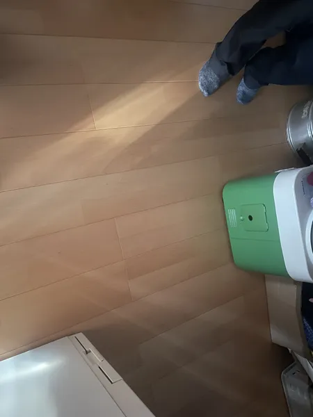 工事内容: 洋室・フローリングリフォーム。腐食した畳・合板・床根太を解体撤去後、根太を貼り直し、合板を敷設。新規フローリングを施工。併せてぐらついていた階段の補修を実施。