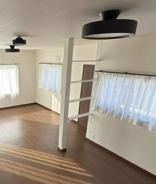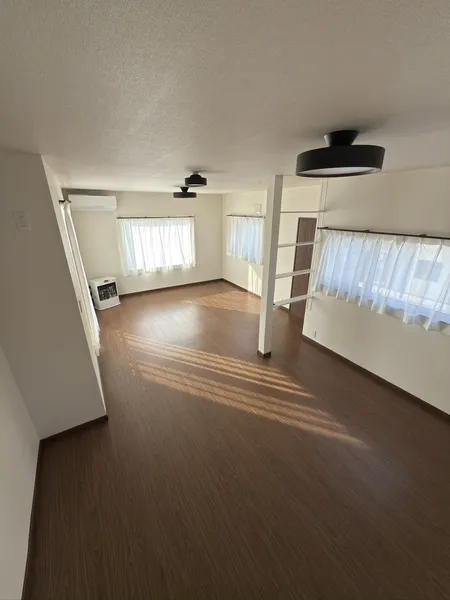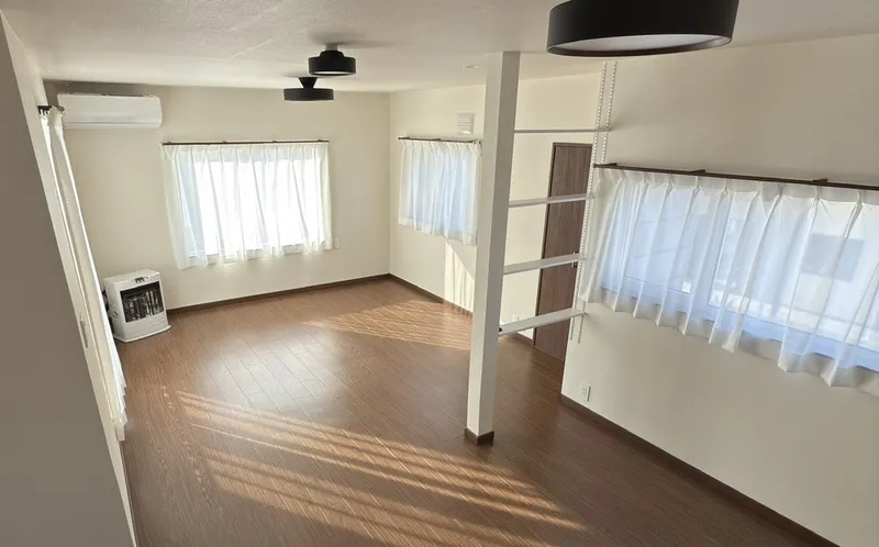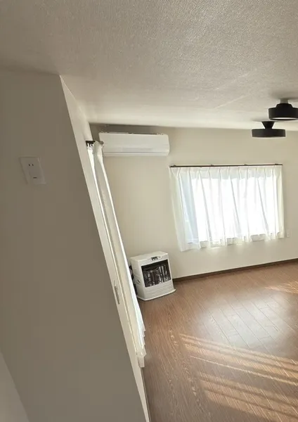 工事内容: 元々あった部屋に増築された部屋があり、そのふたつの部屋をひとつの部屋の間取りにするためにリフォームをおこなった。間取りの変更と窓の変更。天井と床をフラットにつなげる工事。出入り口の扉の交換。部屋の前の廊下の改装。エアコン取り換え、ストーブ設置。クロス張替え。電気回路の増設や位置変更、照明設備の交換。