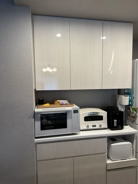 工事内容: キッチンの上部に食器棚を設置する。こども用の食器やカトラリーを置く食器棚も設置して、そのうえに炊飯器や電子レンジ、コーヒーメーカーなどを置くスペースを確保