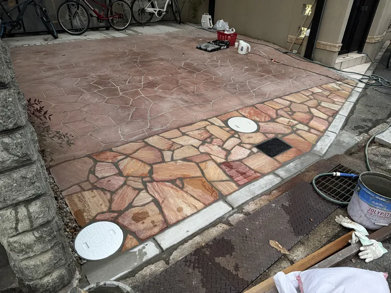 漏水で水が滲み出ていたので、コンクリートを斫り、配管をやりかえて、乱系石を施工致しました。