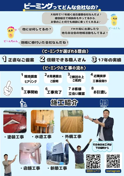 株式会社ビーミングは、神奈川県大和市を中心に地域密着で活動している会社です。住まいのお困りごとに丁寧に対応し、多くのお客様からGoogleクチコミで高評価をいただいております。これからもお客様に安心してご相談いただける会社を目指し、親切・丁寧なサービスを心がけています。子育てグリーン住宅支援事業や先進的窓リノベ事業、給湯省エネ補助金にも対応しております。