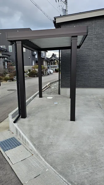 工事内容: 駐車場の土間コンクリート(ワイヤーメッシュ含む)、型枠工、5号枠石敷き、防水シート敷き、残土と砂利処分、サイクルポート設置工事(ジーポートプロYKK、積雪対応、4本柱で3台分)、折半屋根(ペフなし)。